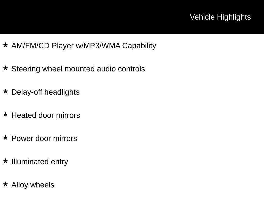 Alloy wheels, AM/FM/CD Player w/MP3/WMA Capability, Delay-off headlights, Heated door mirrors, Illuminated entry, Power door mirrors, Steering wheel mounted audio controls.