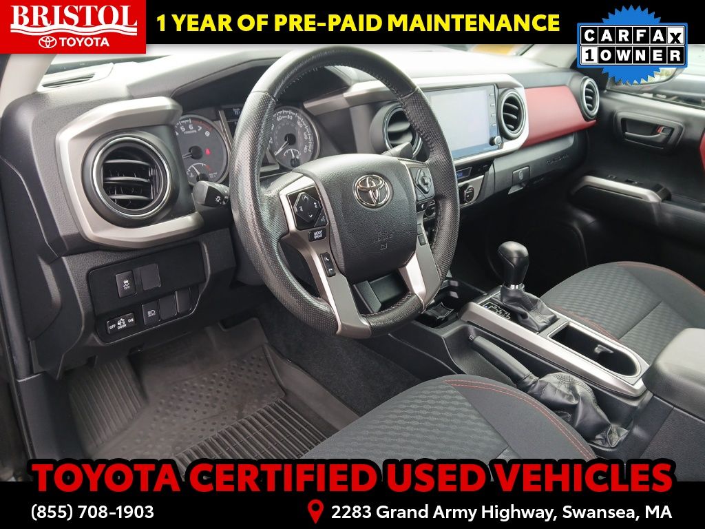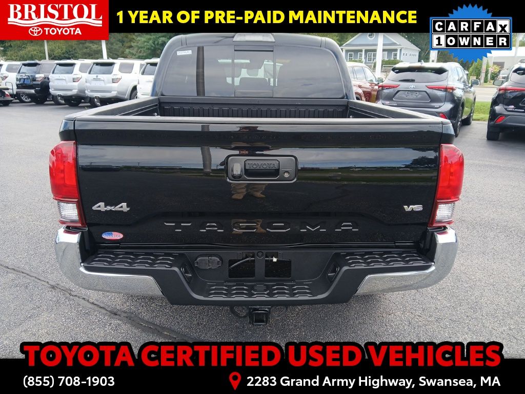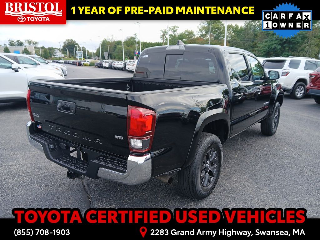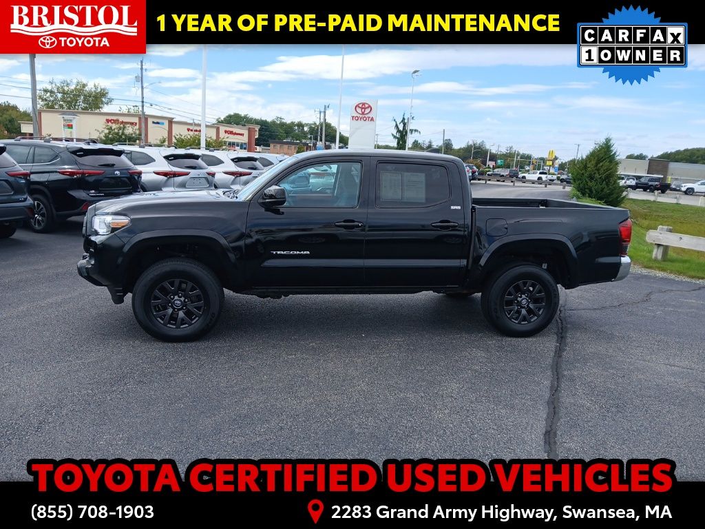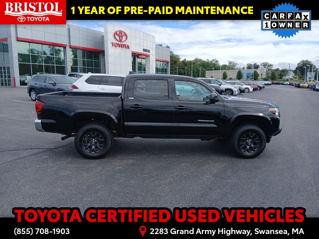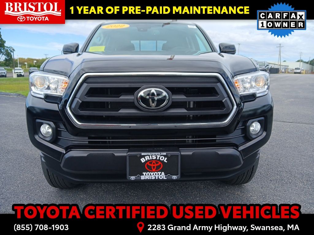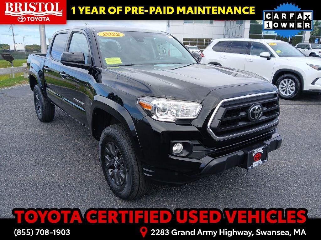TOYOTA CERTIFIED 7 Year/100,000 Mile Warranty!! Odometer is 3203 miles below market average! CARFAX One-Owner. Clean CARFAX.Backup Camera, Bluetooth, Hands-Free, Alloy wheels, Apple CarPlay/Android Auto, Bar Gray Ring Chrome Front Grille, Color-Keyed Overfenders, Daytime Running Lamps, Exterior Parking Camera Rear, Front Fog Lamps, Illuminated entry, Power driver seat, Power Sliding Rear Window w/Privacy Glass, SR5 Package, Steering wheel mounted audio controls.Toyota Gold Certified Details: * 160 Point Inspection * Transferable Warranty * Vehicle History * Roadside Assistance * Warranty Deductible: $0 * Roadside Assistance for 7 Year / 100,000 Mile. Standard New-Car Financing Rates Available. Warranty honored at over 1,400 Toyota dealers in the continental U.S. & Canada. Trade-ins accepted. Trouble-free handling of your transaction, including DMV paperwork * Powertrain Limited Warranty: 84 Month/100,000 Mile (whichever comes first) from TCUV purchase date * Limited Warranty: 12 Month/12,000 Mile Limited Comprehensive Warranty: 12 Month/12,000 Mile (whichever comes first) from certified purchase datePlease call ahead today to make sure this vehicle is in stock! We're here to answer any questions. You can be confident that every used car we sell will be trouble free and reliable! Because if it's not, we won't sell it. Bristol Toyota is the only dealership in New England to have won Toyota's President's Award for over 35 consecutive years. Bristol Toyota..."Where friends send friends, Every Day!"Midnight Black Metallic 2022 Toyota Tacoma SR5 V6 4D Double Cab 4WD 6-Speed Automatic 3.5L V6 PDI DOHC 24V LEV3-ULEV70 278hp