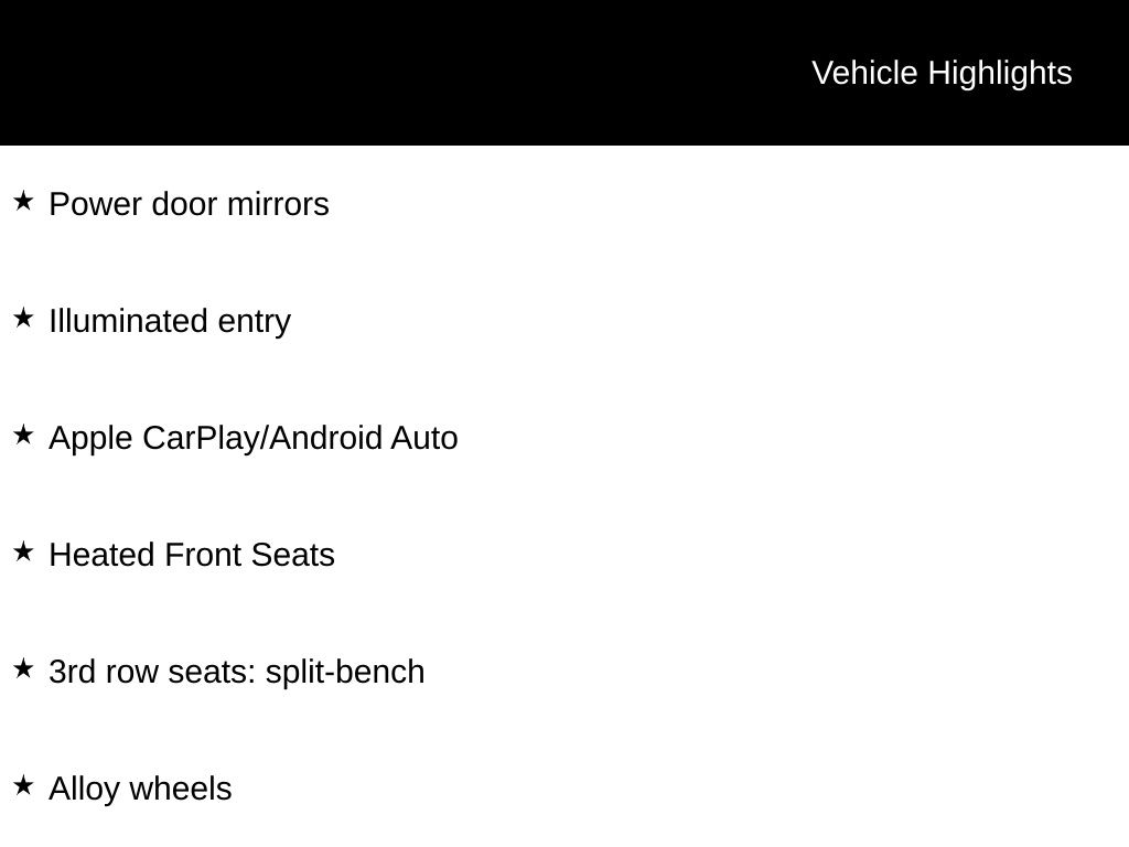 Backup Camera, Bluetooth, Hands-Free, 2nd Row Bench Seat, 3rd row seats: split-bench, Alloy wheels, Apple CarPlay/Android Auto, Exterior Parking Camera Rear, Heated door mirrors, Heated Front Seats, Illuminated entry, Power door mirrors, Power Liftgate, Radio: 12.3" Toyota Audio Multimedia, Steering wheel mounted audio controls.