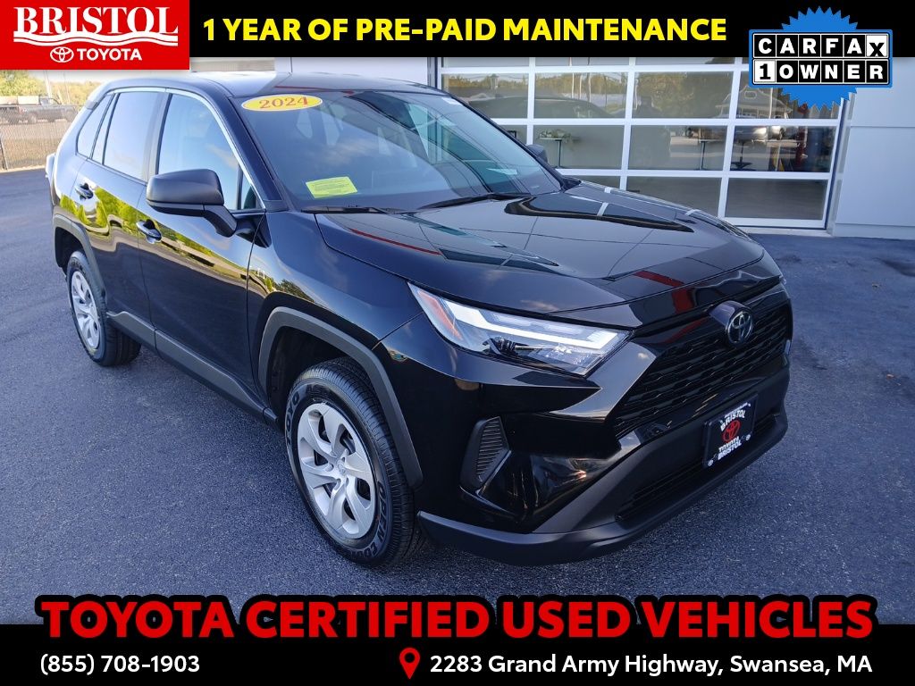 TOYOTA CERTIFIED 7 Year/100,000 Mile Warranty!! CARFAX One-Owner. Clean CARFAX.Brand New Tires!, Backup Camera, Bluetooth, Hands-Free, Exterior Parking Camera Rear, Illuminated entry, Power door mirrors, Radio: AM/FM/XM Audio System, Steering wheel mounted audio controls.Toyota Gold Certified Details: * Vehicle History * Roadside Assistance * Transferable Warranty * Limited Warranty: 12 Month/12,000 Mile Limited Comprehensive Warranty: 12 Month/12,000 Mile (whichever comes first) from certified purchase date * Roadside Assistance for 7 Year / 100,000 Mile. Standard New-Car Financing Rates Available. Warranty honored at over 1,400 Toyota dealers in the continental U.S. & Canada. Trade-ins accepted. Trouble-free handling of your transaction, including DMV paperwork * Warranty Deductible: $0 * Powertrain Limited Warranty: 84 Month/100,000 Mile (whichever comes first) from TCUV purchase date * 160 Point InspectionPlease call ahead today to make sure this vehicle is in stock! We're here to answer any questions. You can be confident that every used car we sell will be trouble free and reliable! Because if it's not, we won't sell it. Bristol Toyota is the only dealership in New England to have won Toyota's President's Award for over 35 consecutive years. Bristol Toyota..."Where friends send friends, Every Day!"Midnight Black 2024 Toyota RAV4 LE 4D Sport Utility AWD 8-Speed Automatic 2.5L 4-Cylinder DOHC Dual VVT-i 27/34 City/Highway MPG