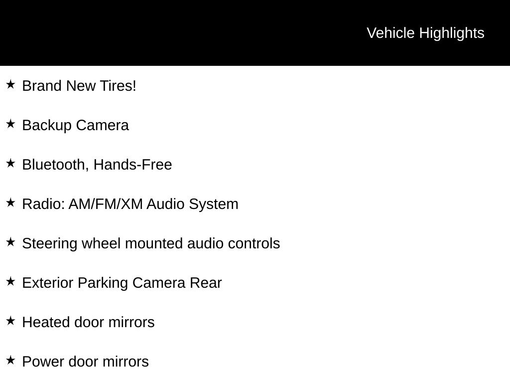 Brand New Tires!, Backup Camera, Bluetooth, Hands-Free, Alloy wheels, Exterior Parking Camera Rear, Heated door mirrors, Illuminated entry, Power door mirrors, Radio: AM/FM/XM Audio System, Steering wheel mounted audio controls.